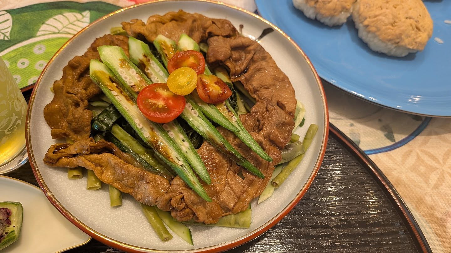 「しゃぶしゃぶも食べたい」とのご希望に合わせ、夏向きの“しゃぶしゃぶサラダ”をご提案。アメリカにはいわゆる“しゃぶしゃぶ用”の薄切り肉がないため、塊肉の扱い方や薄切りにするコツなどもお伝えしました。
