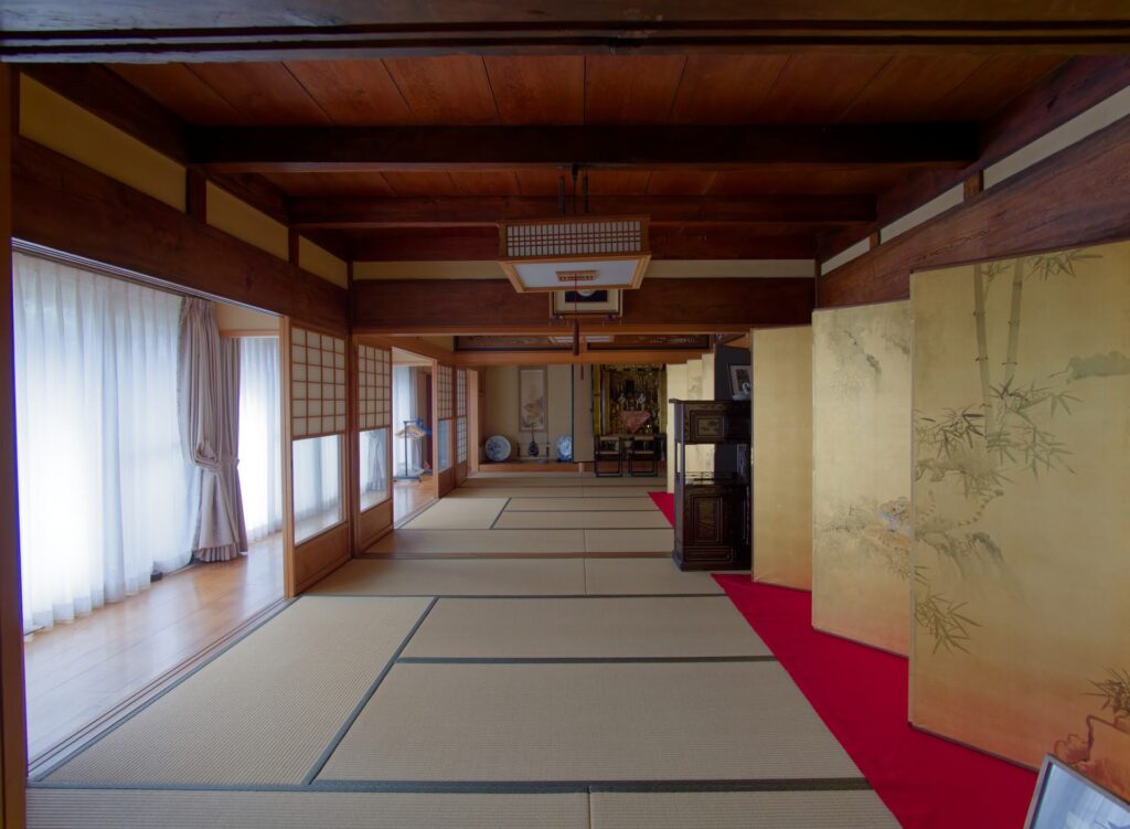 特別な時以外は、各部屋をふすまで仕切って8畳の部屋として使います。使い方は家々によって違いますが、今でいう居間や応接間・趣味の部屋として使われていたようです。