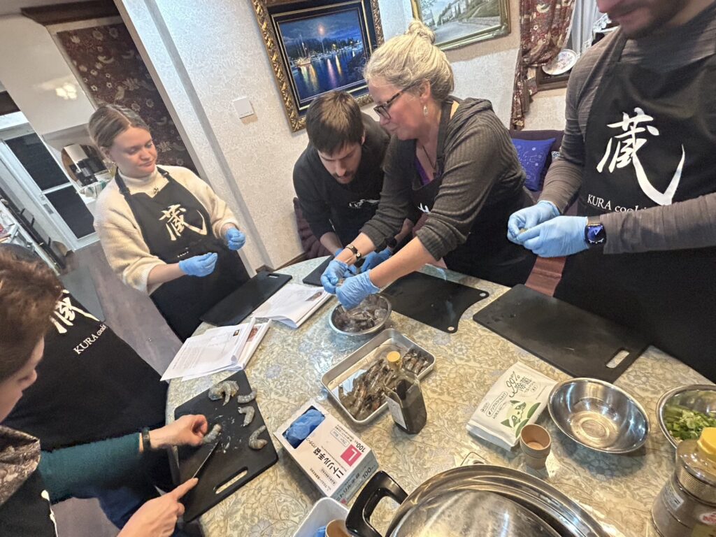 そして、アメリカからリピーターがきてくれました。前回は日本人の彼女と参加してくれた彼が、彼女との結婚式を日本でするということで、親戚と一緒にラーメンと餃子のクラスに参加してくれました。本当に嬉しいことです。今回は肉をぬいたものでというリクエストでしたので、和風だしのシンプルなラーメンとキャベツとエビの餃子・豆腐を使ったゴマ餅を作っていただました。満足していただけたほうです。とても熱心に餃子の包み方を学んでいただきました。