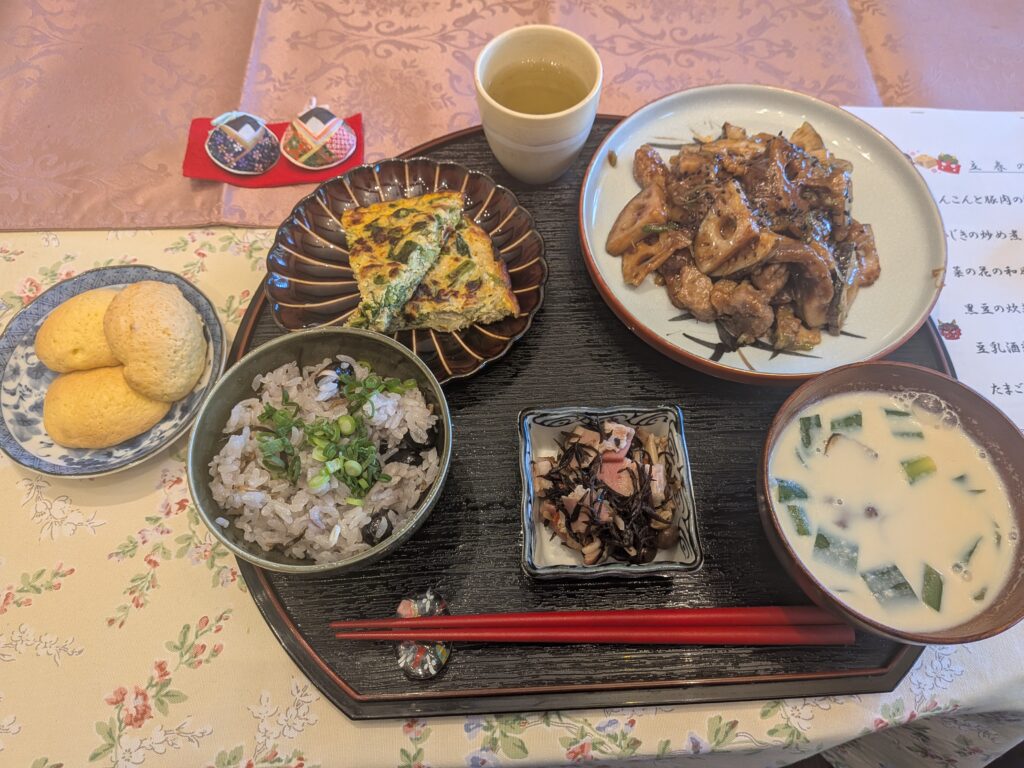 柚子・生姜・ネギなどを塩分の代わりに使ったり、黒い食材を使った腎にいいメニュー、少し苦みのある菜の花を使った肝にいいメニュー。また、昨年仕込んだ味噌を使ったメニューも登場しました。名古屋飯の要望がありましたので手羽先・天むすを作っていただいたクラスもありました。