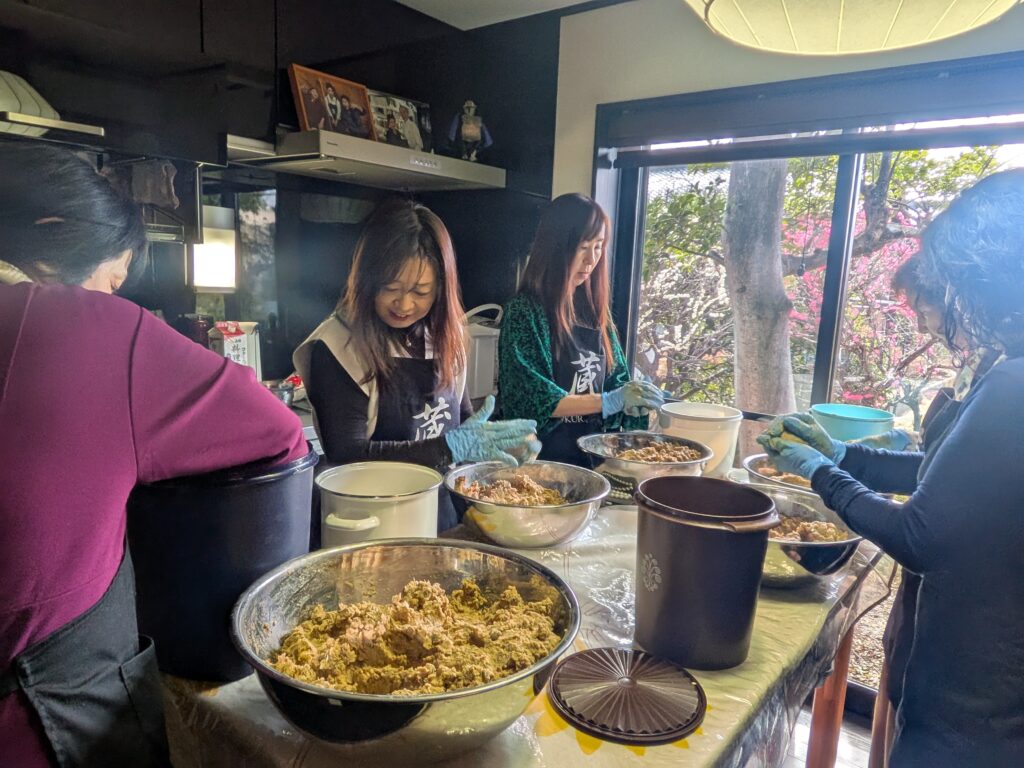 作られている皆さんの楽しそうなお顔!様々な方法で豆をつぶし、力を入れて混ぜ、愛情をこめて器に投げ込む。美味しい味噌ができないわけがありません。