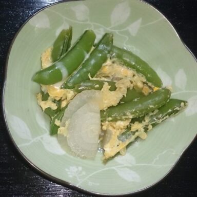 スナップえんどうと新玉ねぎの卵とじ