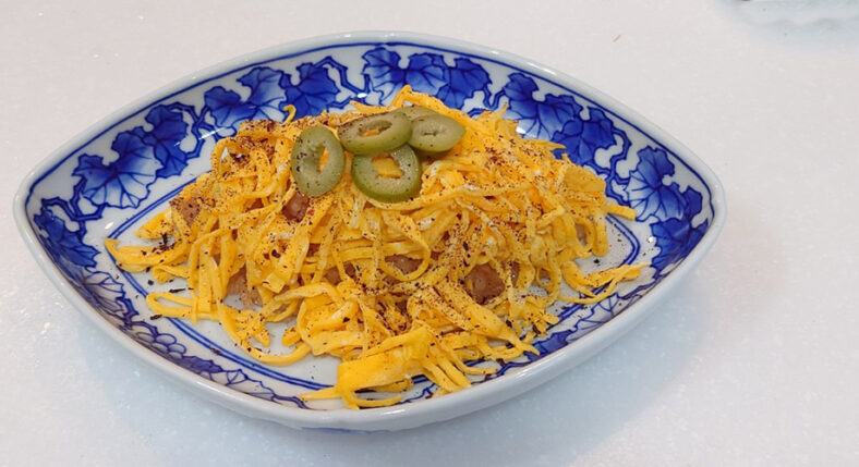 - Mix eggs, sugar and salt well, add potato starch water and make thinly fried eggs.