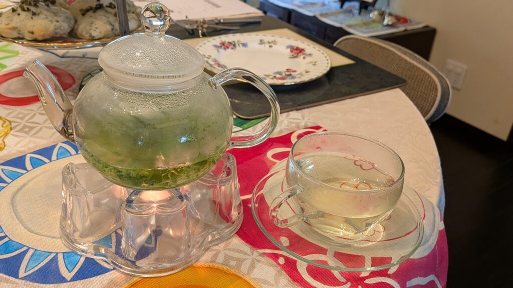 We enjoyed basil bread with salted basil berries, cheese scones with lots of chopped basil leaves, Cake with basil and tomato sauce. We drank basil herb tea, and summer pudding tea.