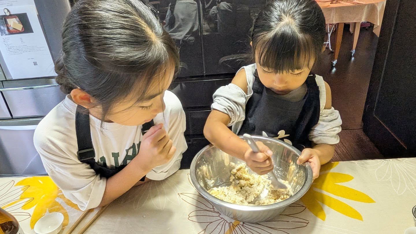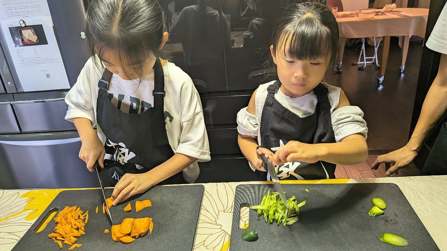 The older sister had asked to attend a cooking class, which is why they joined us today. Since she often cooks at home, she was already very skilled at cutting, mixing, and plating. Watching her big sister, the younger one also worked hard and did wonderfully. It was heartwarming to see the older sister making sure her sibling stayed safe, showing how close they are.