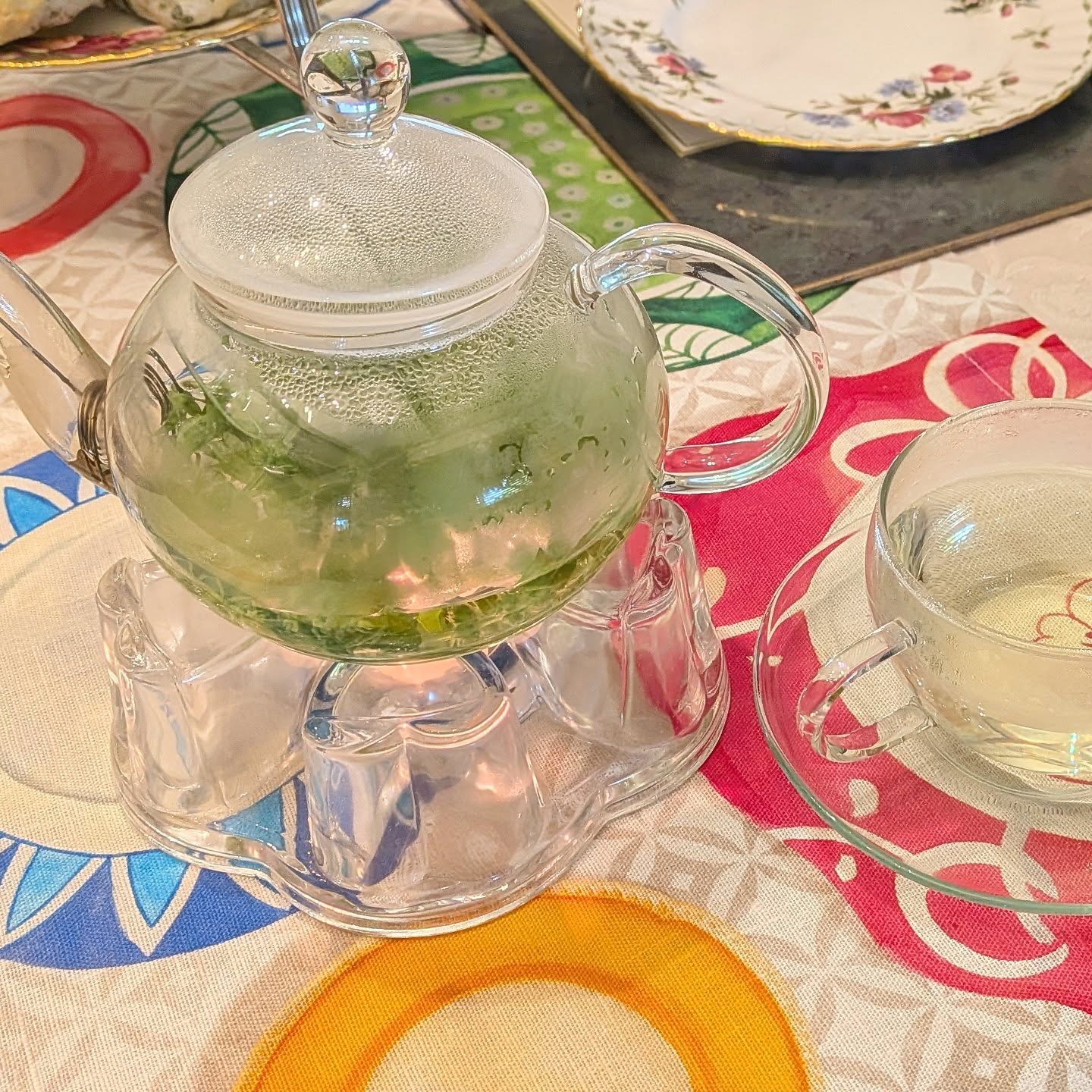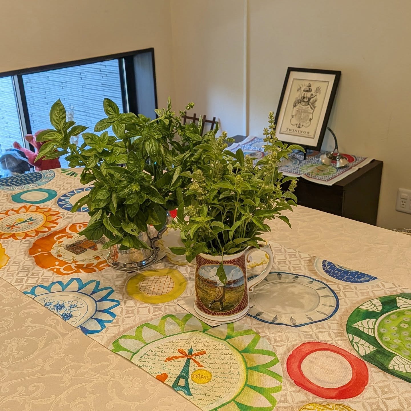 A colorful tablecloth I bought at a French exhibition adds even more charm to the table.