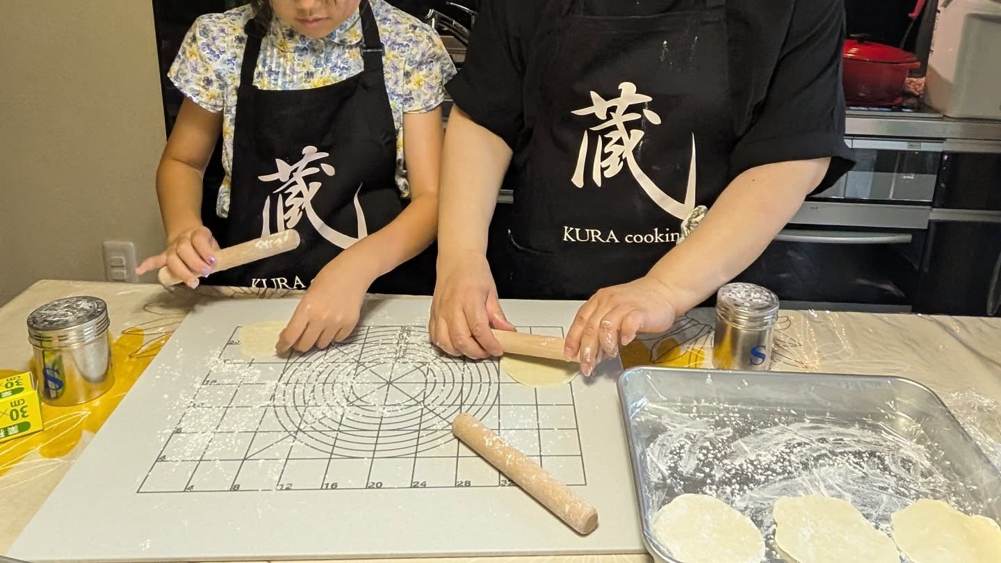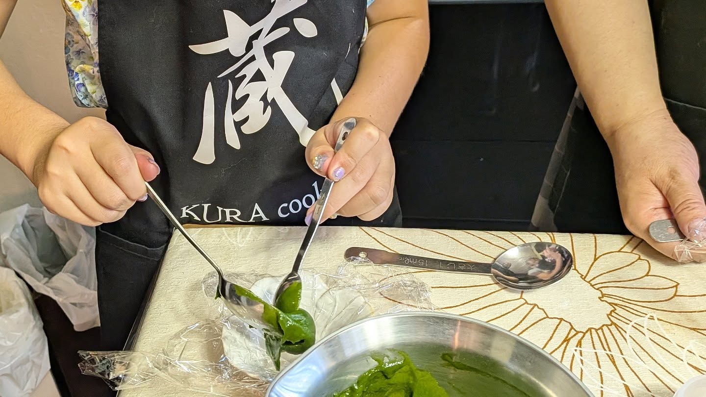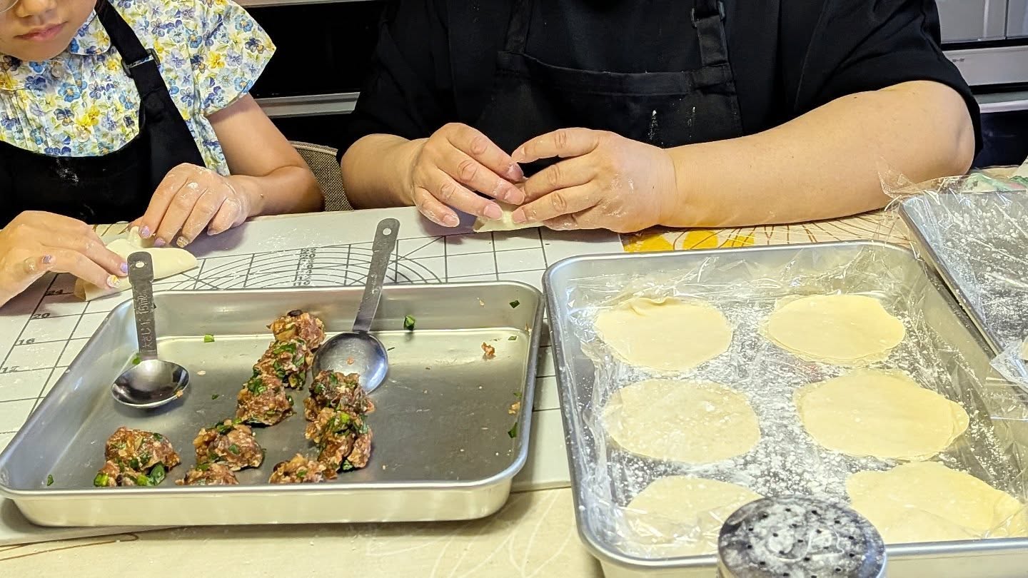 In today’s class, a lovely parent and child made ramen, gyoza, and a refreshing summer dessert—matcha water cakes filled with plum bean paste.