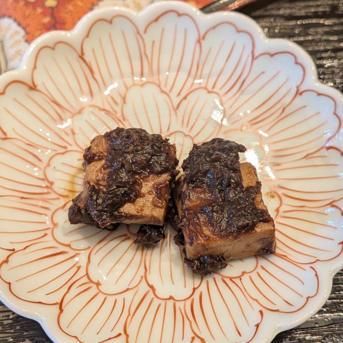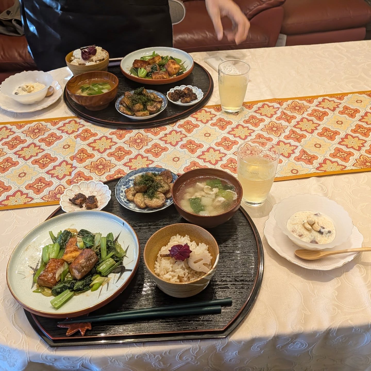 For the welcome drink, we served ginger roselle tea, which warmed the body nicely. Peeling taro and making fresh ginger juice took a bit of time, but he enjoyed the process very much.The requested miso-marinated cheese and rice pudding turned out delicious, and it seems he’ll be making them again at home.
