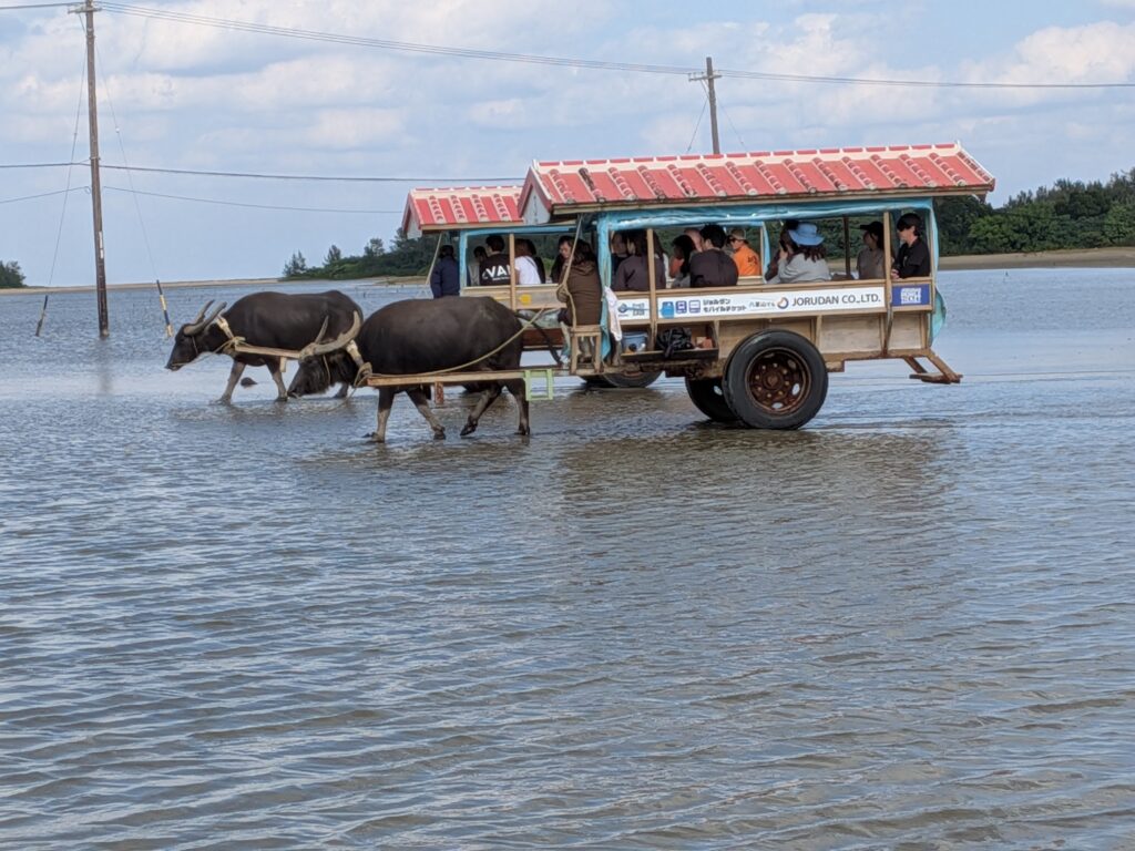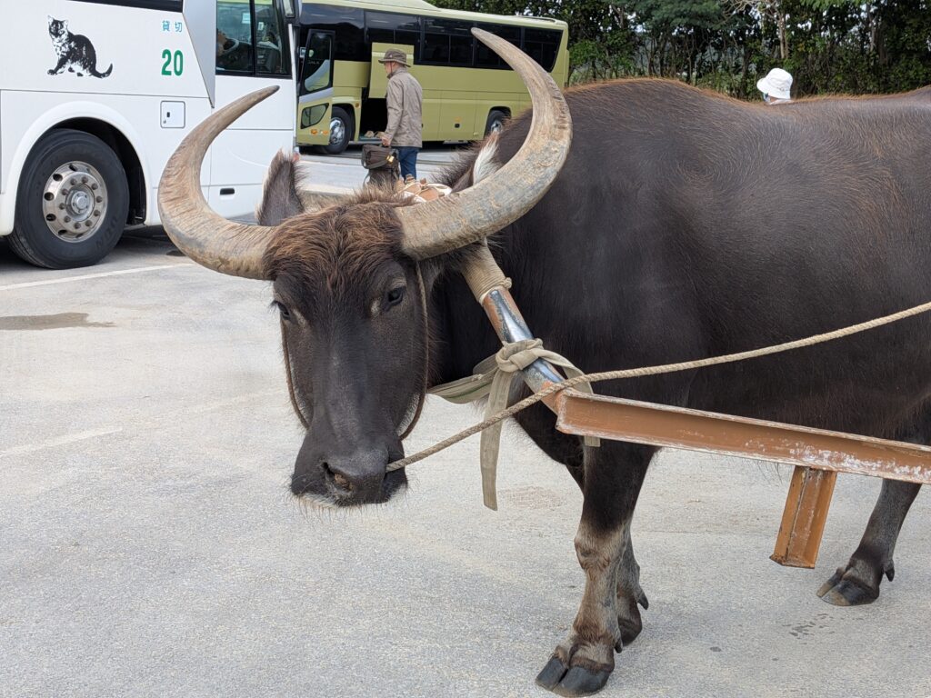 After that, we rode a water buffalo cart to Yufu Island. Ten people rode in the cart pulled by a water buffalo, and they were so adorable. Each buffalo had a different face; the one pulling our cart, Ichiro-kun, was very gentle and good looking. Along the way, there was a sanshin (three-stringed instrument) performance, which was very Okinawan and made for a lovely time.