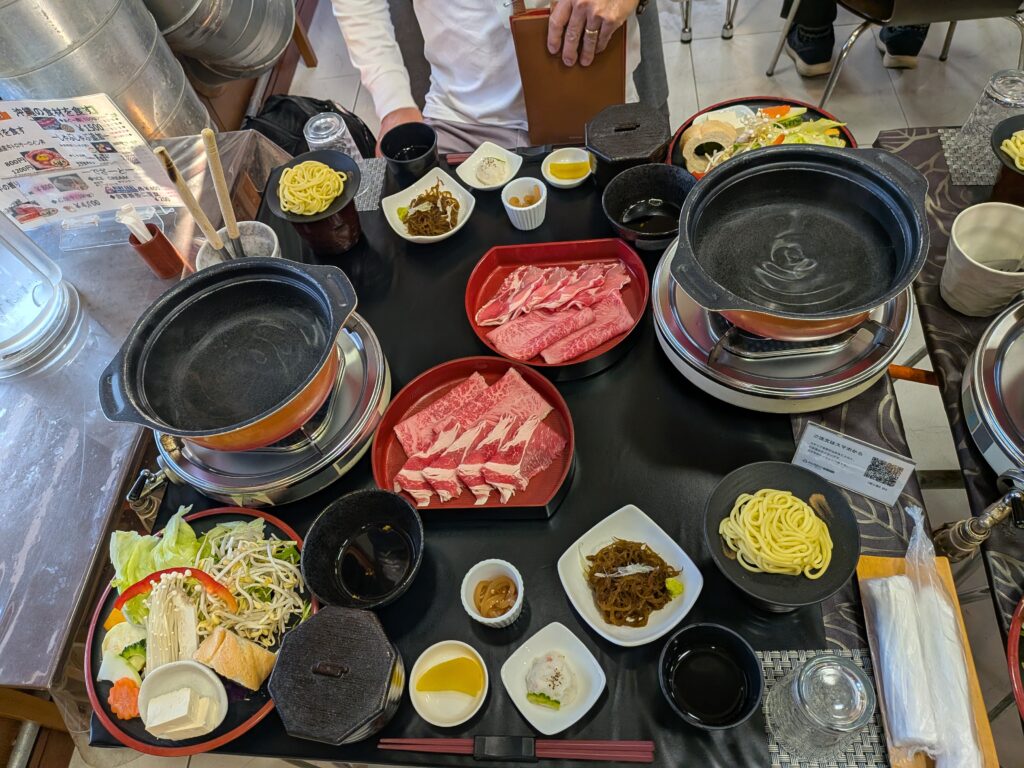 For dinner, we ate Okinawan Island shabu-shabu made with Okinawan vegetables, Agu pork, and Ishigaki beef. We finished with Yaeyama soba. After the shabu-shabu, we seasoned the remaining broth of the shabu-shabu with salt and pepper, added the noodles, and ate them. This was delicious and not too heavy.