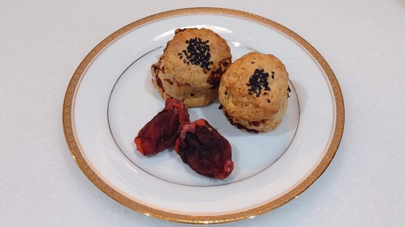 - Cut out 5 with scone cutter, brush milk on top and put black sesame seeds on the top and bake at 200 degrees for 18 minutes.