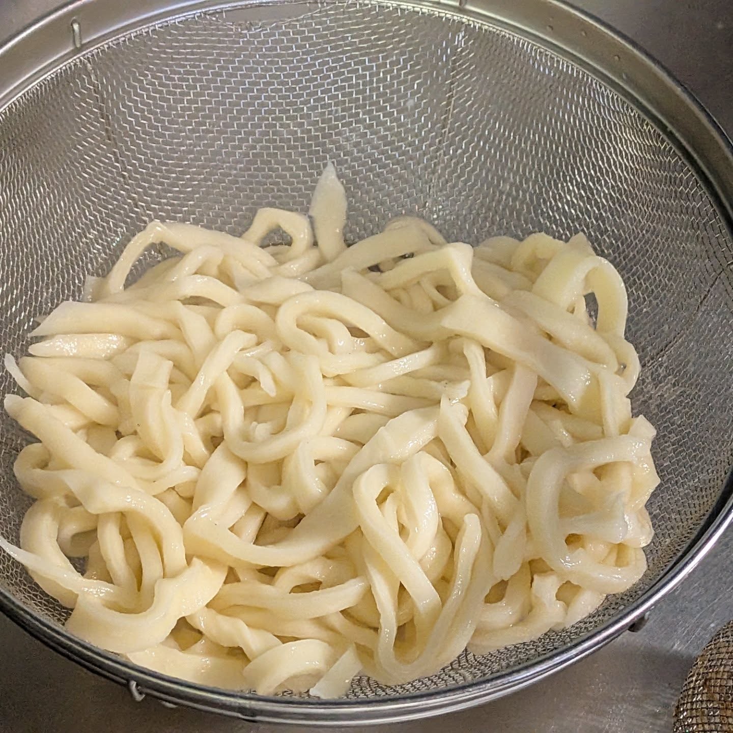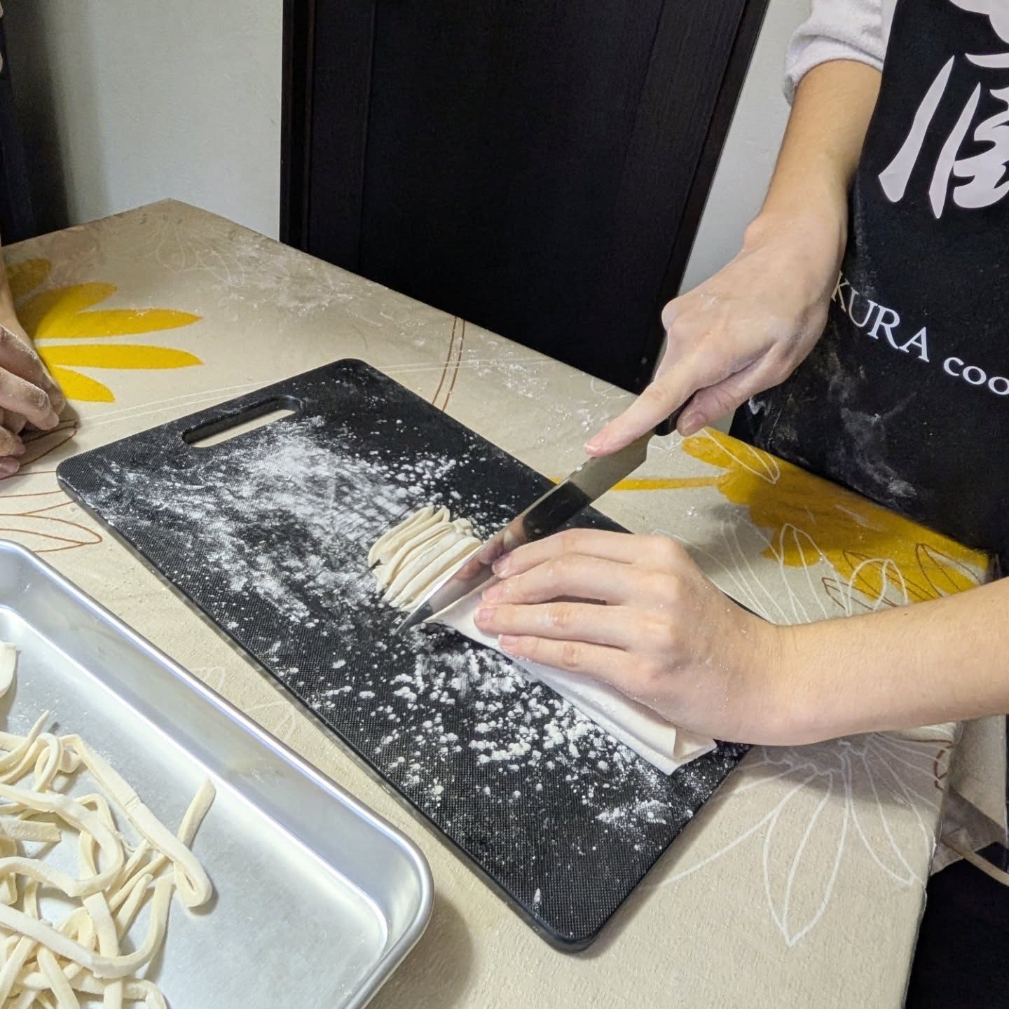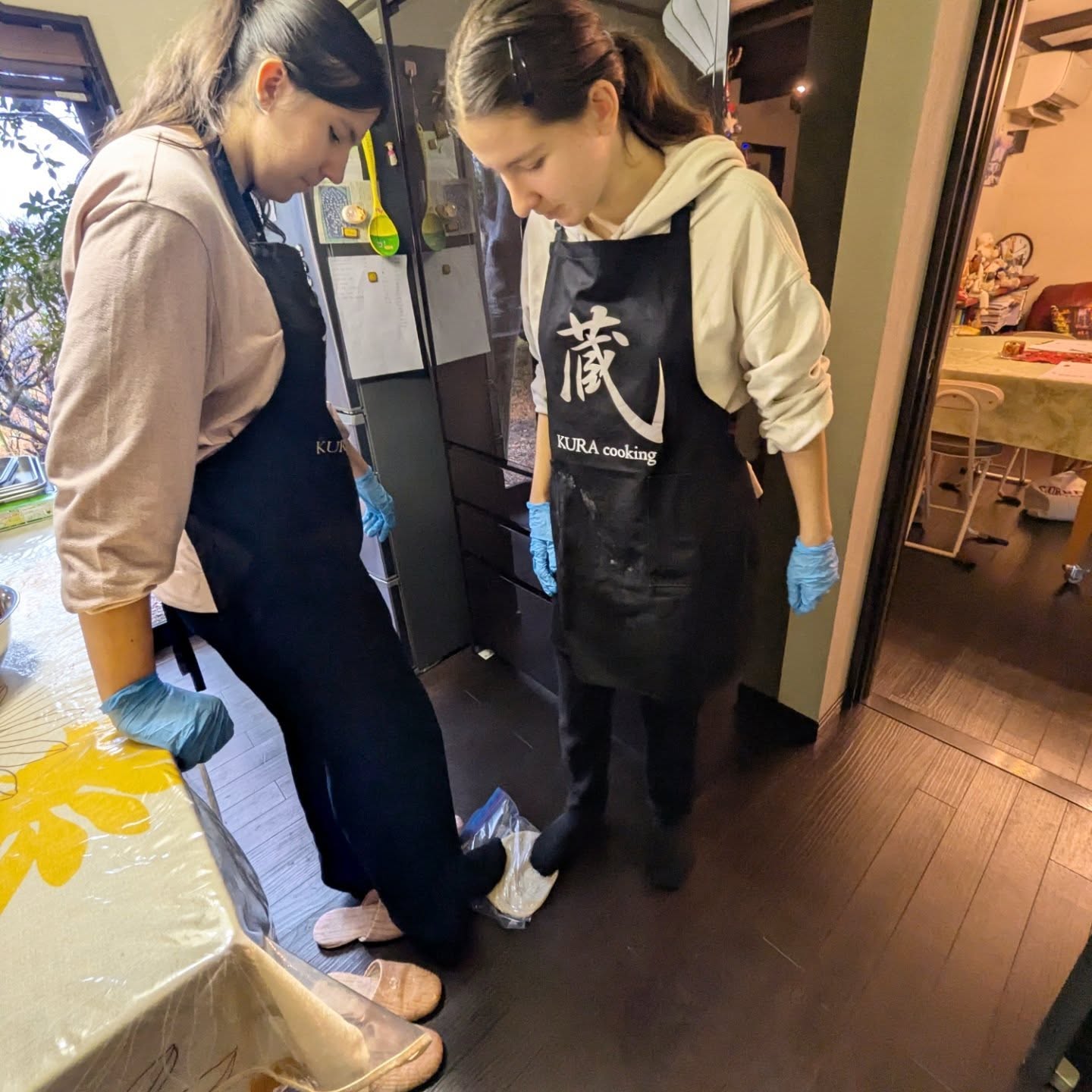 Every year, two sisters from Armenia come to visit Kura Cooking. This time, they asked to make miso nikomi udon and a seasonal cake, so we started by making the udon noodles from scratch.