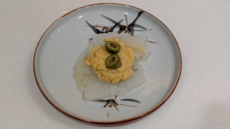• Place the hummus on top of the steamed onions from step 2. Add olives and season with salt and pepper.