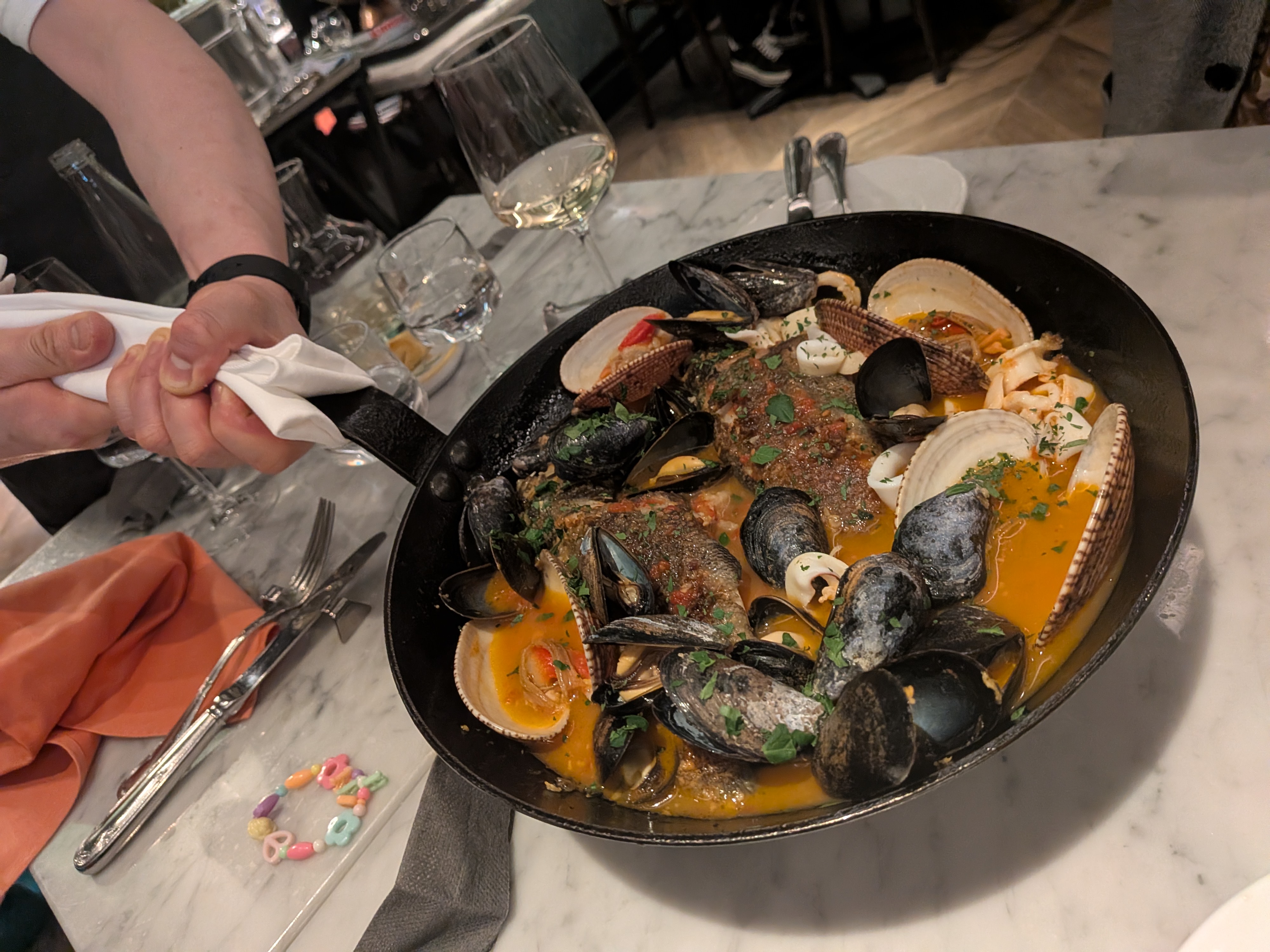 We went to the Italian restaurant “Boga Marì Cucina Mediterranea” inside Azabudai Hills. The restaurant features a display of fresh seafood. We choose what kind of seafood we wanted, and then chose the cooking methods we wanted. We ordered carpaccio, bouillabaisse, breaded scallops, and my granddaughter’s favorite shrimp cream pasta, and a fish platter. Everything was delicious. The fish, shellfish, and shrimp were incredibly fresh and plump! For dessert, the chef brought out a birthday plate ( a plate of desserts with “Happy Birthday” written on it in chocolate) while someone played the accordion. My granddaughter sang loudly, making it a truly joyful moment. My daughter gave me Chanel hand cream, and my granddaughter gave me a lovely birthday card. They were heartfelt gifts.