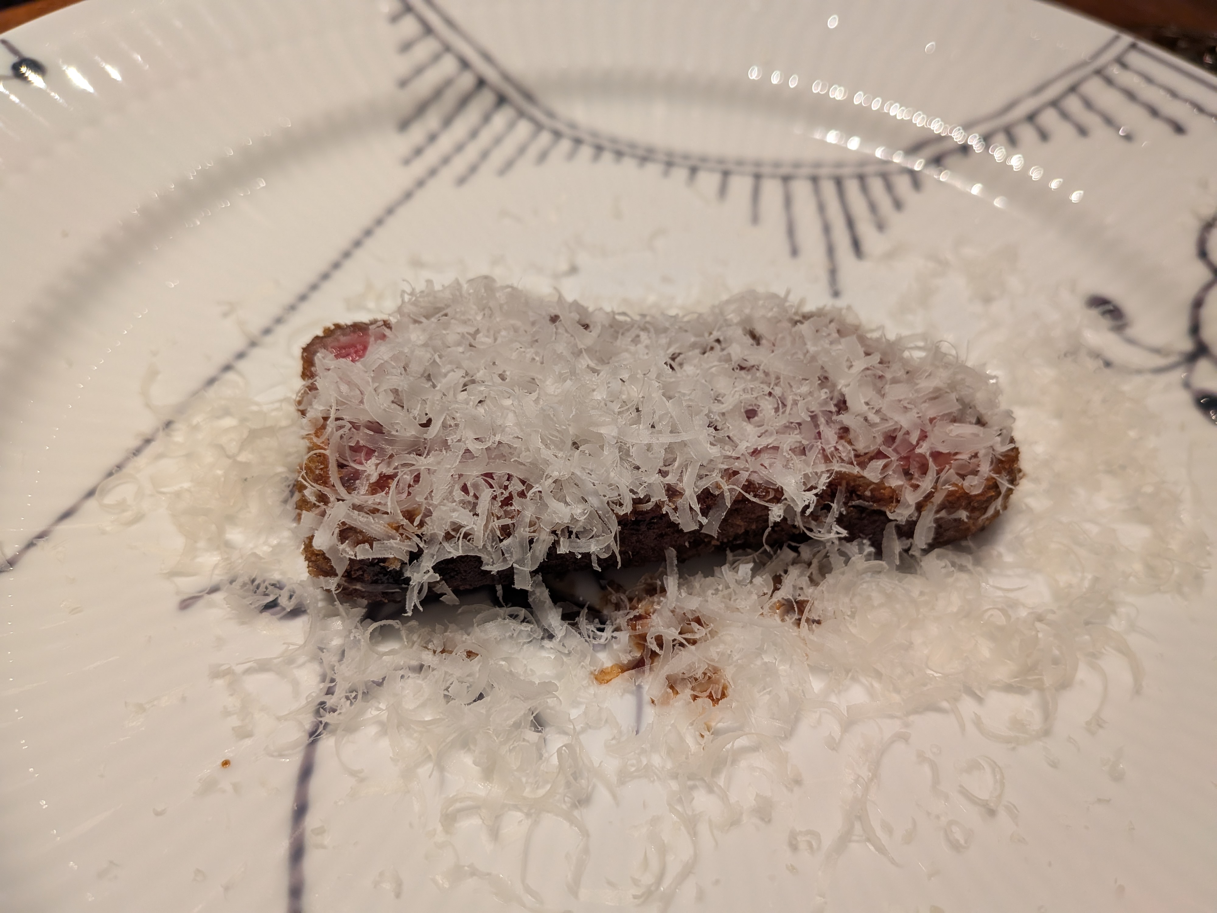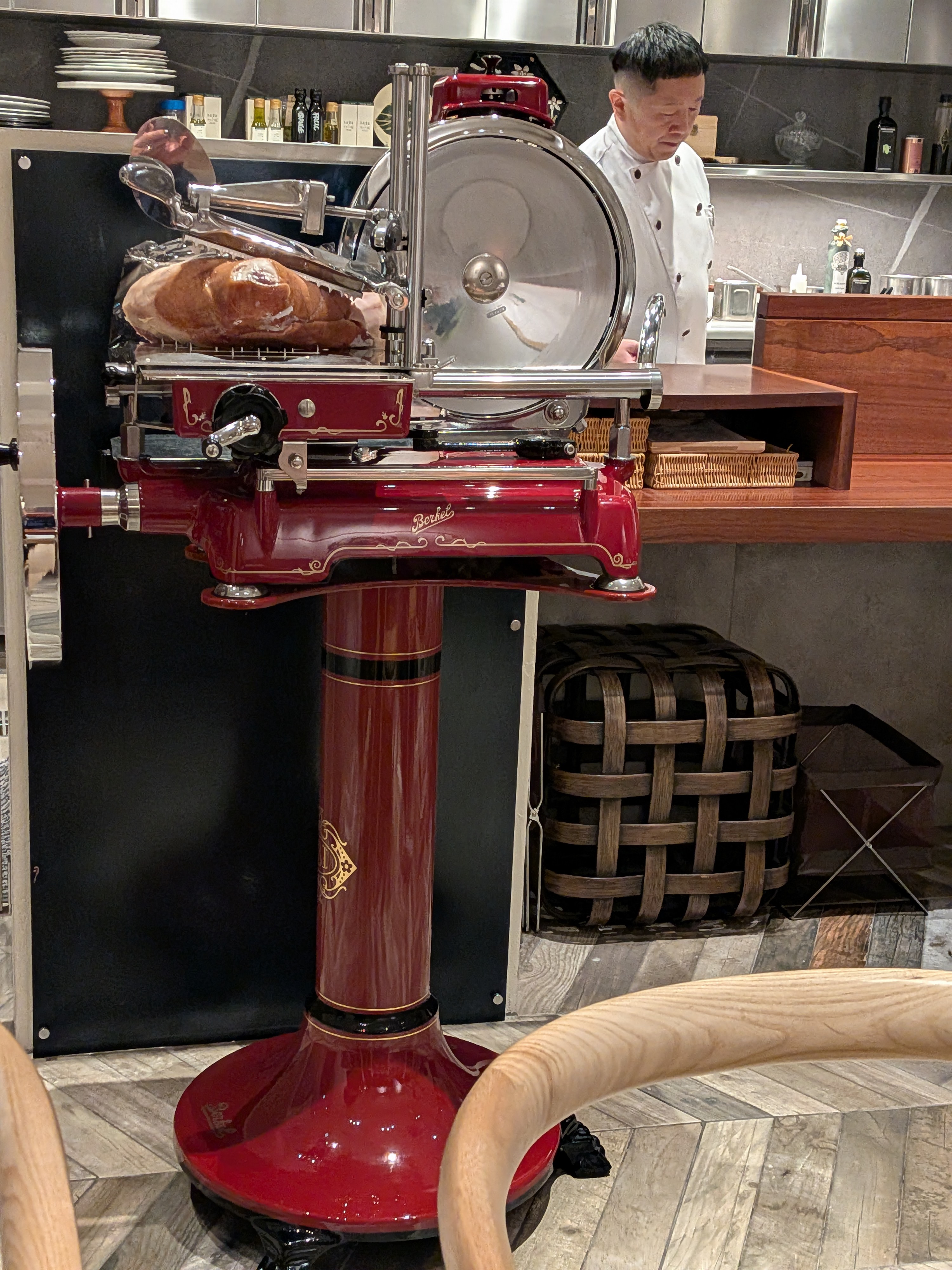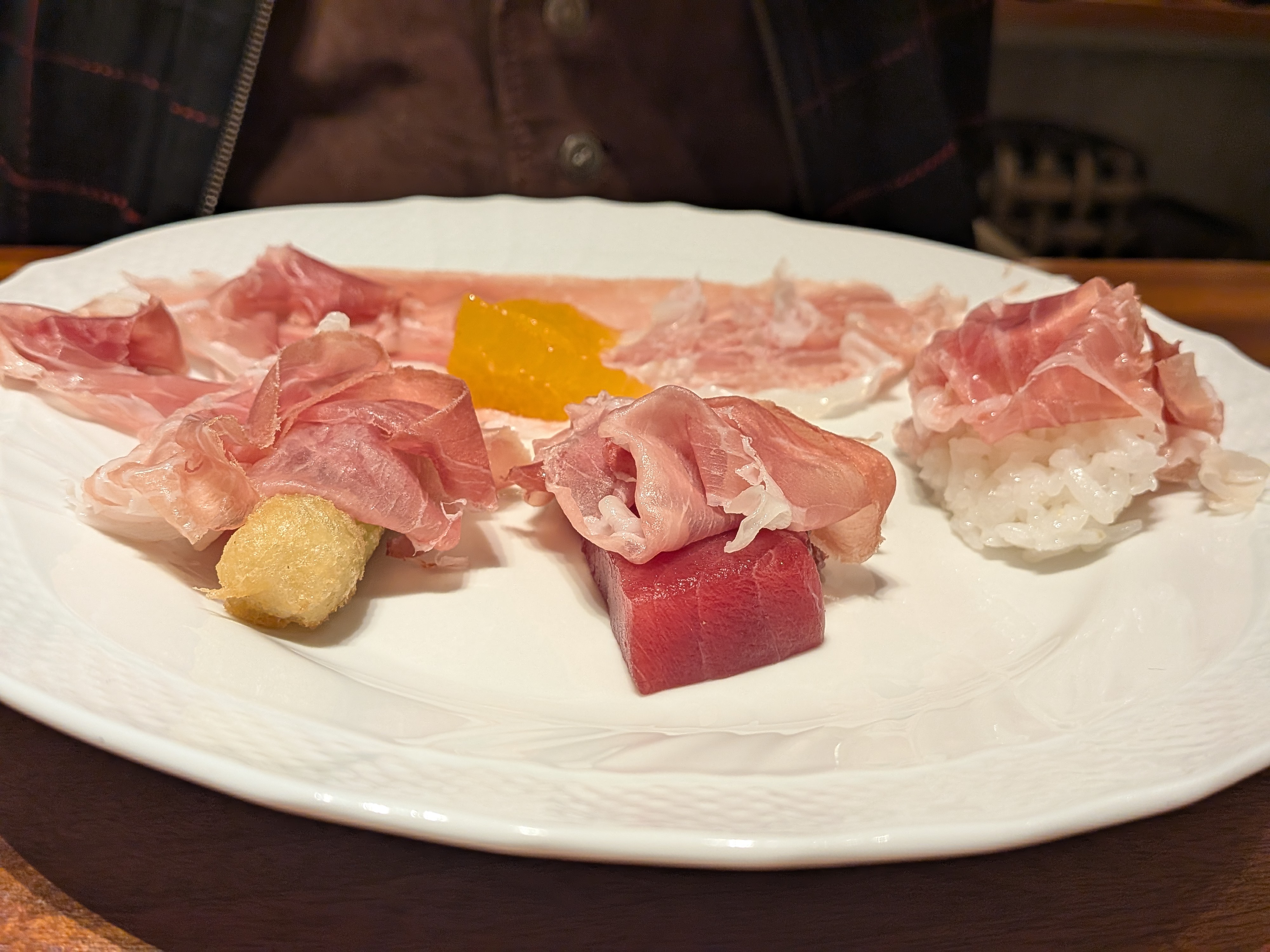The prosciutto slicer they used was also very stylish. It was a Berkel from Italy, and besides being a slicer, it also looks beautiful in the restaurant. The accompaniments for the freshly sliced prosciutto were also interesting: freshly cooked rice (which was the brand -Dragon Eye), fatty tuna, vegetable fritters, and orange. I was taken aback for a moment at the combinations, but each one was incredibly delicious. The first appetizer, sea urchin and fermented butter on toast, was lighter and easier to eat than expected. Other dishes were maitake mushroom soup, clam bolognese bianco, cod with bagna càuda, cutlet, truffle and potatoes au gratin, and pasta arrabbiata. Despite highlighting the natural flavors of the ingredients, each dish was a marvel from a truly talented chef, full of delightful surprises. Suddenly, the restaurant went completely dark, and the chef brought out a birthday plate. It was lovely that other guests told me -Happy Birthday-.