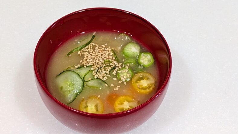 This chilled miso soup is perfect for summer. Eating it with summer vegetables helps expel excess body heat.