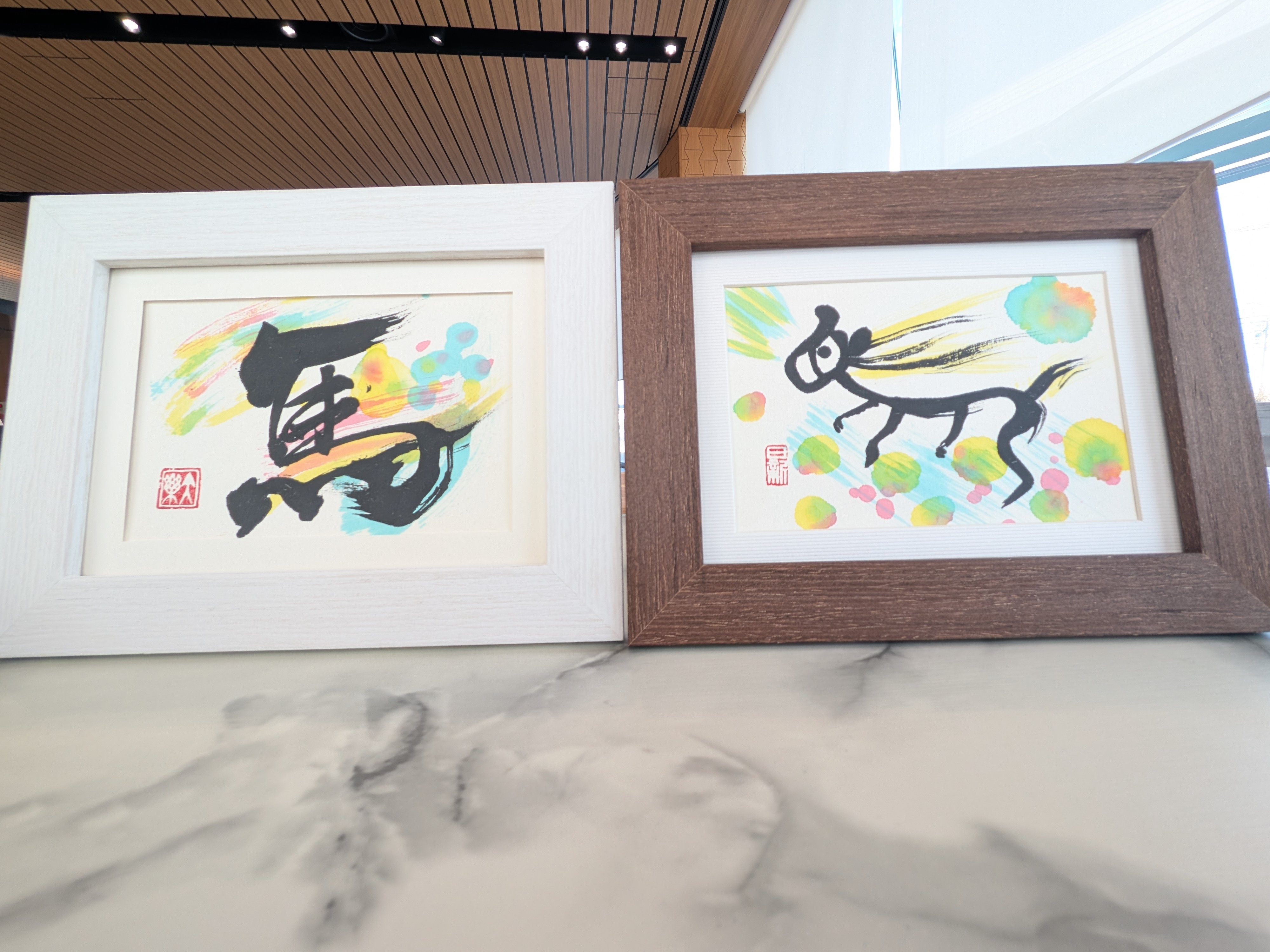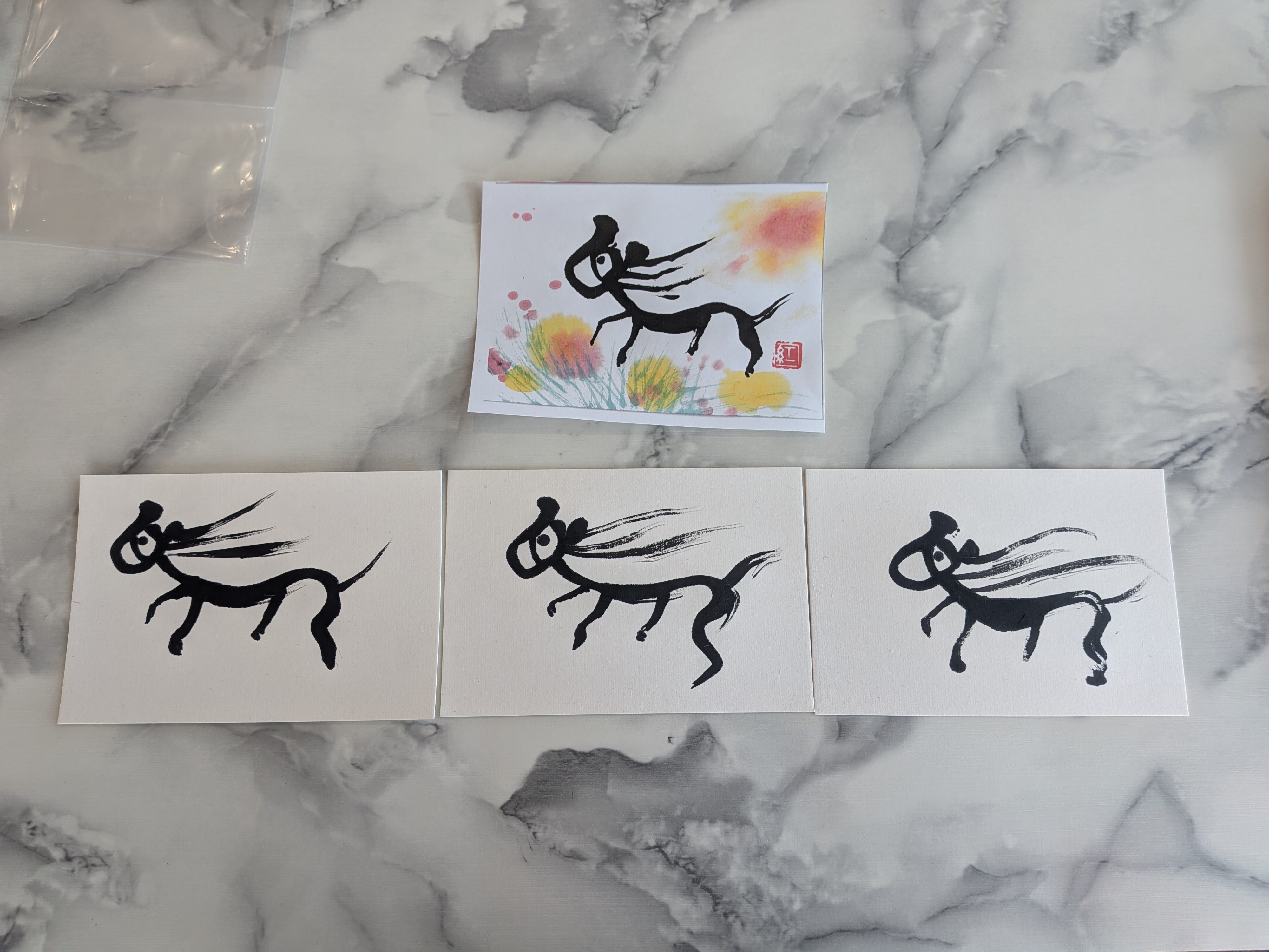My husband’s solid, grounded “馬” (horse) and my bouncing, pictographic “馬” (horse).