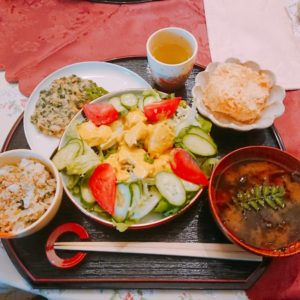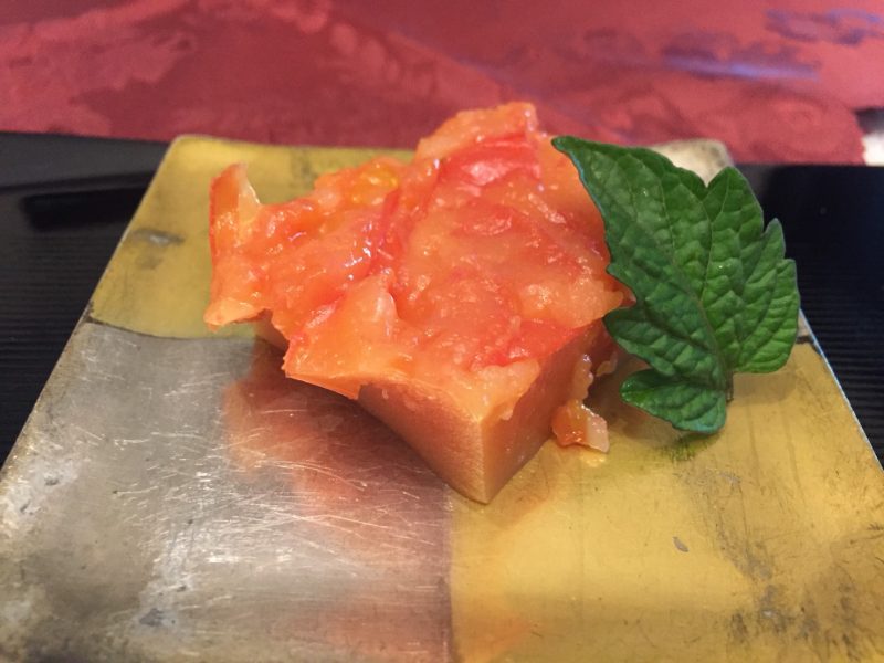 Steamed chicken breast with yogurt, Croquet of new potatoes and Kimchi, Rotus and fresh leeks dumplings, Japanese honeywort rice, Butterbur miso soup, Japanese tomato steamed cake