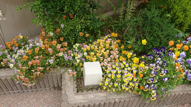 Many flowers were blooming beautifully in my flower bed by the gate.