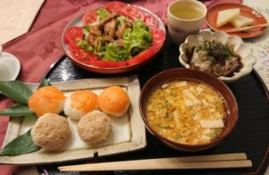 Ball-shaped sushi・No broth miso soup・Baked onion・Teriyaki chicken・Steamed Japanese cake