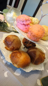 We enjoyed making sweets flavored with cherry blossoms: Cherry blossom scones (with cherry blossom jam and clotted cream), Lemon syllabub, and Hot cross buns. The cherry blossom scones were pink like cherry blossoms, they seemed to be half English and half Japanese