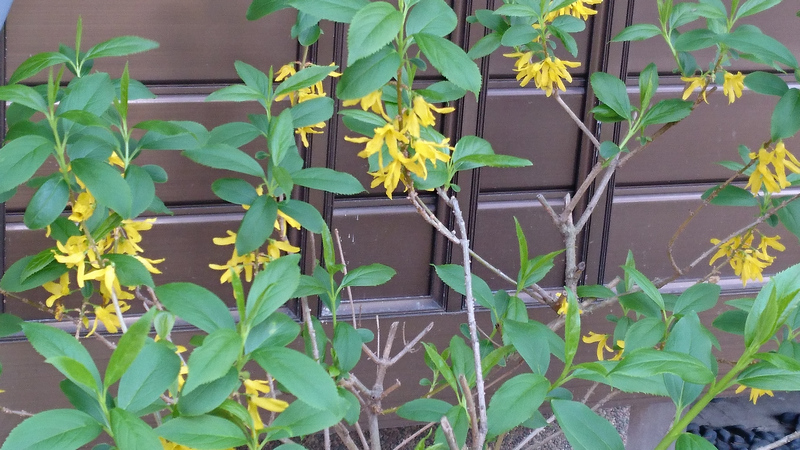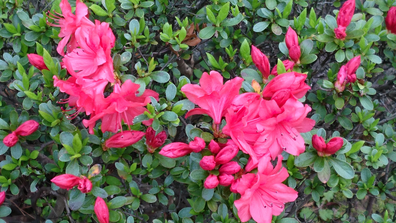 From left to right, you can see satsuki azalea,azalea heath, and forsythia.