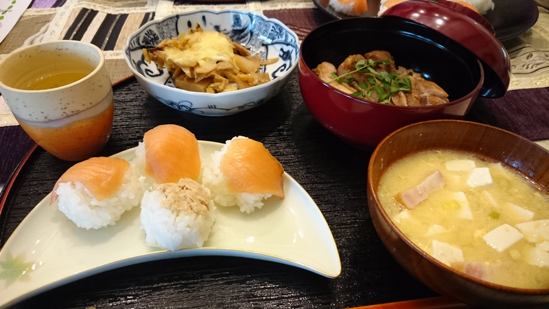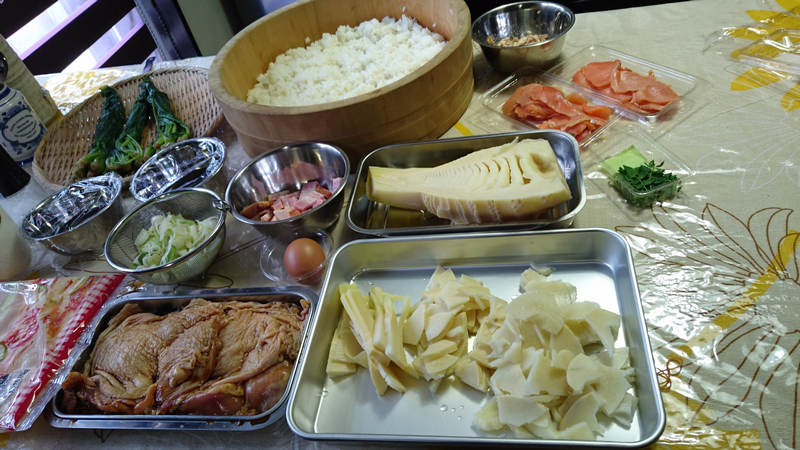 They wanted to make Japanese spring dishes, so we made ball-shaped sushi (salmon and tuna), teriyaki chicken, gratin of bamboo shoots, miso soup, and rice jelly.I served cherry blossom tea as a welcome drink. They liked the slightly salty taste. They said it was the first time they had tasted it.They could make ball-shaped sushi very well, but their sushi became bigger and bigger. They liked crispy chicken skins. In Europe usual chicken thigs come with the bone but in the Netherlands they can get boneless chicken thighs. They tasted 4 kinds of bamboo shoots. The first was plain boiled bamboo shoots, ➡ The second was bamboo shoots boiled with soy sauce, sugar, and sake.➡ Next was bamboo shoots boiled with soy sauce, sugar, sake and mayonnaise ➡And finally the third and with melted cheese on them They enjoyed the many different ways of cooking them. The miso soup had no broth. We used bacon instead of broth. We added miso and egg. It was really tasty. It was western-style miso soup.