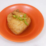 Cut the top off the fried bean curd, open the inside, stuff 4 inside, and stop the top with a toothpick.