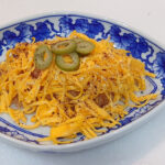 4を型抜きし、5を上に飾り、オリーブの塩漬けのスライスをのせゆかりをかける