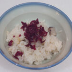 一人ずつ盛り付けたらローゼルの塩漬けのみじん切りを上にのせる